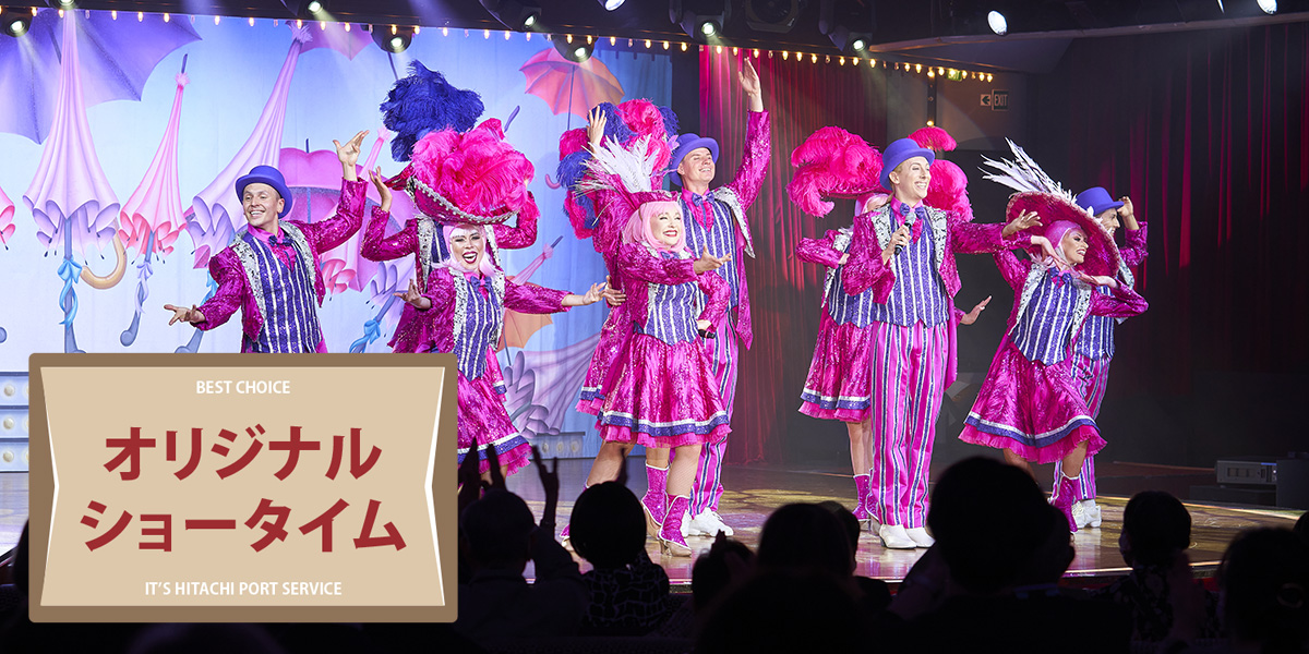 華やかなダンスと歌声で魅せる「飛鳥II」自慢のプロダクションショーは特に人気のショータイム。他にも心躍る多様なプログラムをご用意しています。