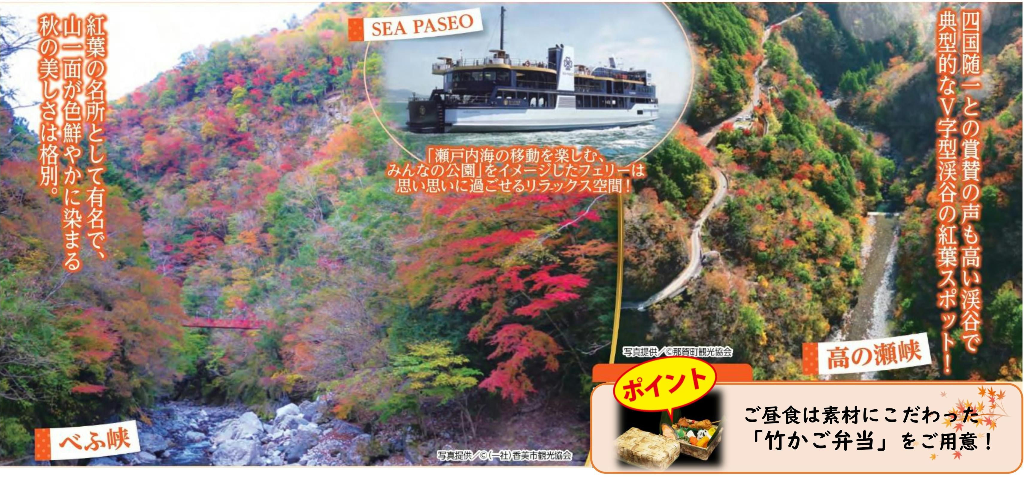 広島港(6:45発)~~<SEA PASEO>~~呉港(7:30発)~~松山観光港==《車内にて■竹かご弁当のご昼食》==◎べふ峡/剣山国定公園の物部川源流域にあり山一面が紅葉に染まる名所==◎高の瀬峡/四国随一と言われる人気のもみじの渓谷散策==◎道の駅南国風良里/お買い物==松山観光港~~<SEA PASEO>~~呉港(22:07着)~~広島港(22:52着)