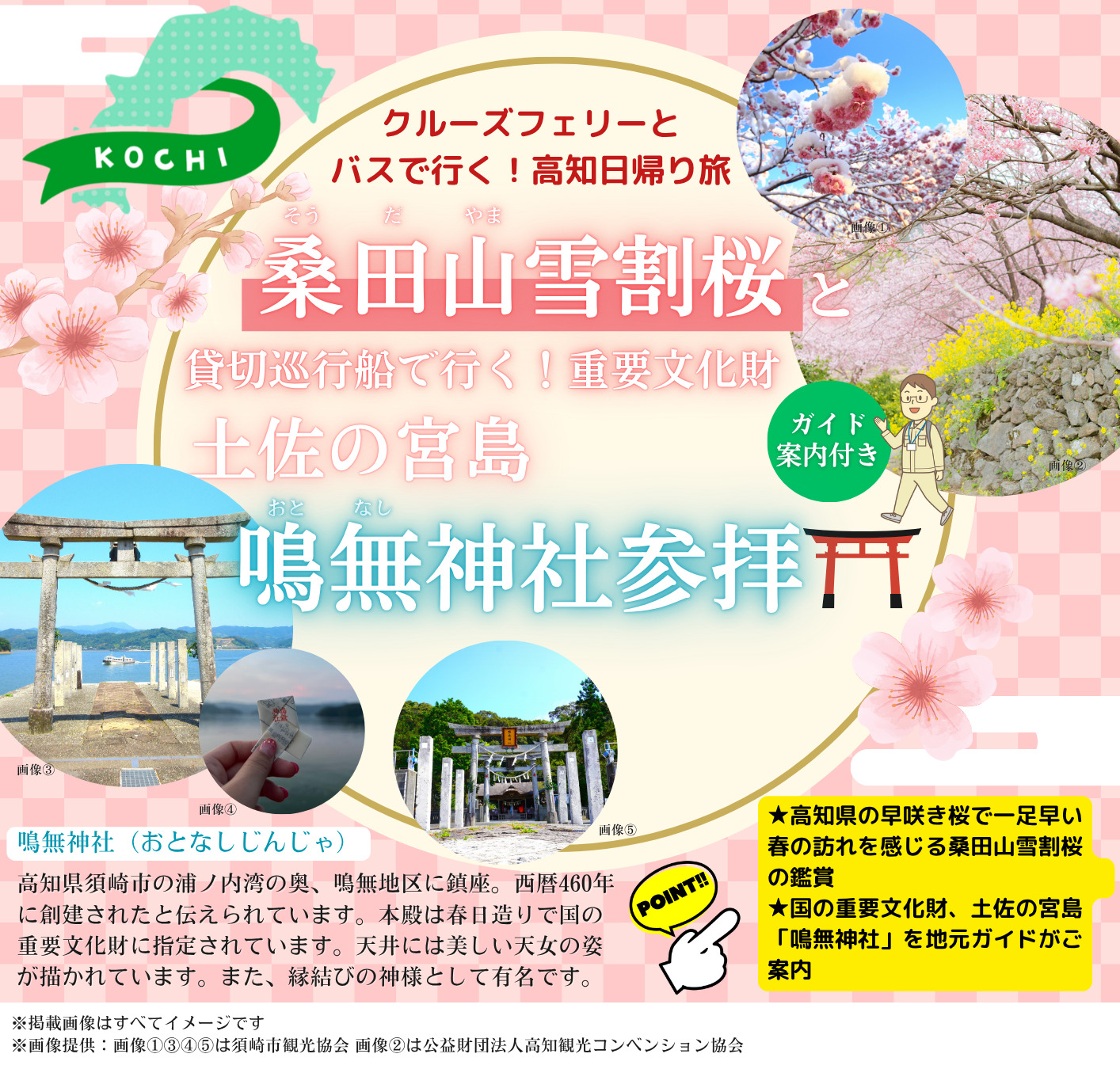 広島港(6:45発)~~クルーズフェリー~~呉港(7:30発)~~松山観光港==貸切バス==◎道の駅天空の郷さんさん/お買い物==車内にて■農家レストランオリジナル弁当のご昼食==◎桑田山雪割桜/山全体に咲く約1,000本の雪割桜観賞==浦ノ内公民館…徒歩…横浪船付場~~巡航船~~鳴無船付場…◎鳴無神社/ガイドと一緒に参拝。本殿は春日造りで国の重要文化財に指定、縁結びの神様として有名…鳴無船付場~~〇浦ノ内湾ミニクルーズ~~横浪船付場==◎道の駅かわうその里すさき/お買い物==松山観光港~~クルーズフェリー~~呉港(22:07着)~~広島港(22:52着)