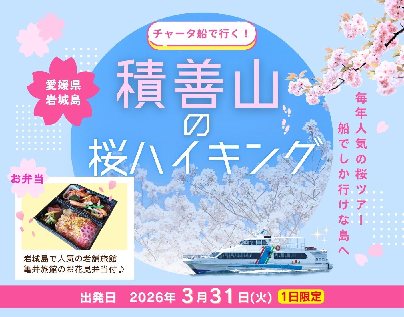宮島口港(7:50発)~~はやしお~~広島港(8:15発)~~プリンスホテル前桟橋(8:20発)~~呉港(8:45発)~~○艦船クルーズ・音戸の瀬戸・安芸灘大橋~~◎岩城島・長江港…積善山桜ハイキング/山全体に咲く桜を見ながら往復約4時間のハイキング(山頂にて■亀井旅館のお花見弁当)…長江港~~岩城港…◎岩城観光センター/お買い物~~○伯方島・開山公園の桜~~呉港(17:35着)~~プリンスホテル前桟橋(18:00着)~~広島港(18:05着)~~宮島口港(18:45着)