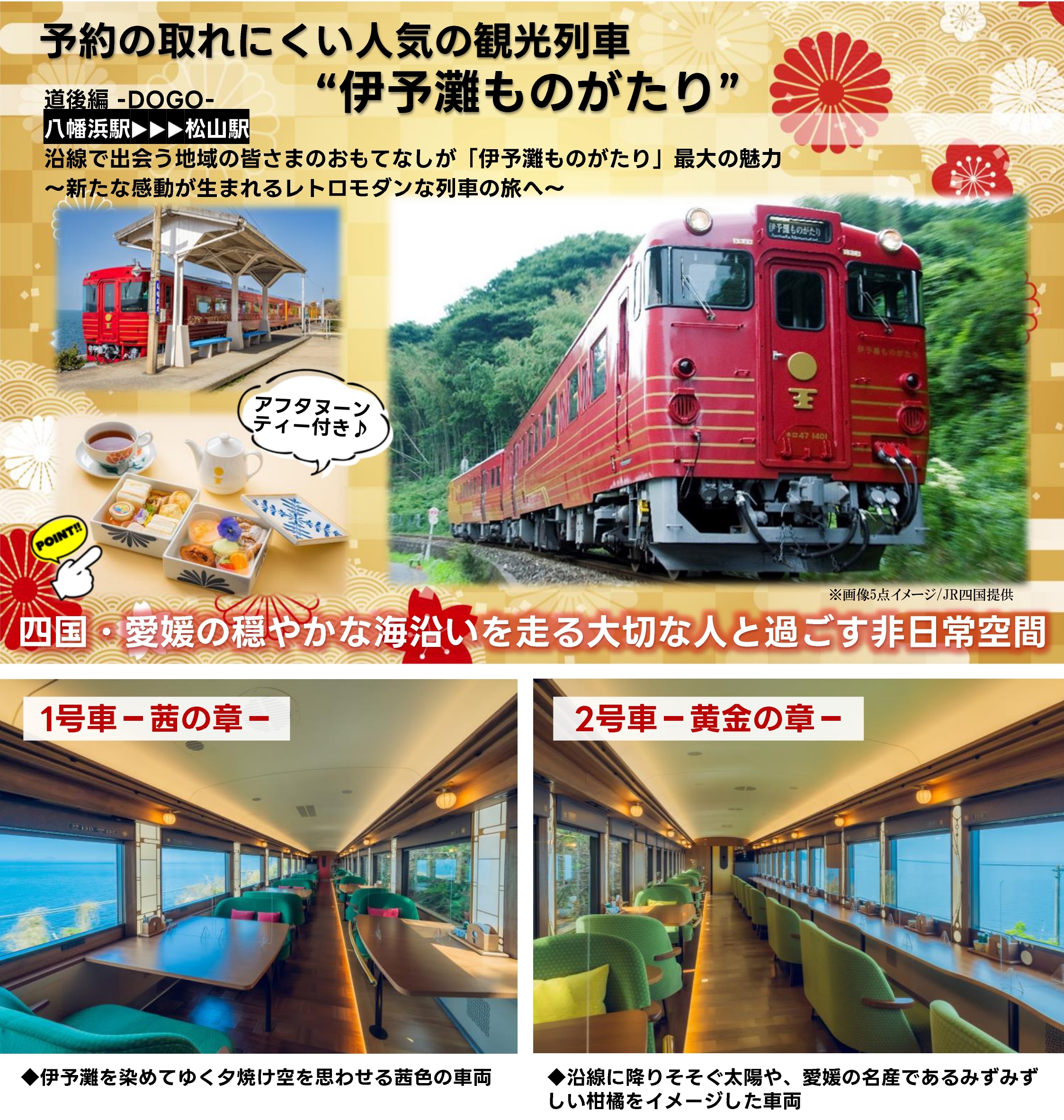 広島港(9:05発)~~リニアジェット~~呉港(9:30発)~~松山観光港==■レストランからり/人気の内子豚もろみ焼き定食のご昼食と◎内子フレッシュパークからり/お買い物==◎大洲まちの駅あさもや/お買い物==◎道の駅八幡浜みなっと/お買い物==JR八幡浜駅##伊予灘ものがたり##■車内にてアフタヌーンティー付##JR松山駅==松山観光港~~SEA PASEO~~呉港(22:07着)~~広島港(22:52着)