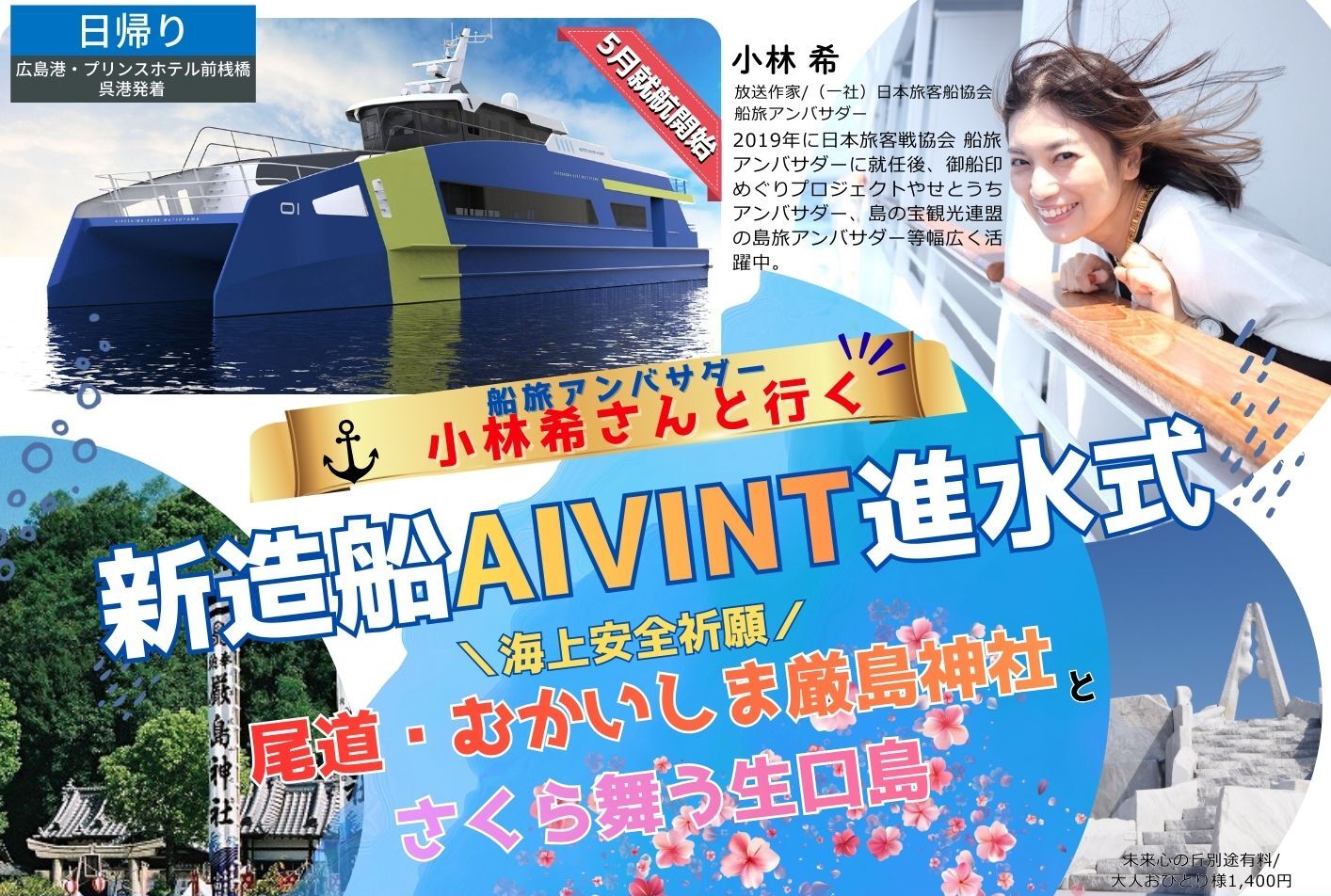 <〇海上自衛隊呉基地沖・音戸の瀬戸・安芸灘大橋>~~船内にて船旅アンバサダーの小林希さんによるトークイベントをお楽しみください※約30分~~尾道駅前桟橋港=<貸切バス>=◎瀬戸内クラフト/新造船AIVINT(アイヴィント)進水式見学=◎尾道・むかいしま厳島神社/海上交易の神様市杵島姫命、商売繁盛・家内安全の守り神事代主命、海の神様大綿津見命の三柱が御祭神として鎮座する日本で唯一の神社参拝=《因島大橋・生口橋》=生口島/■御食事処ちどりにてちどり御膳の昼食と桜舞う耕三寺博物館や人気スポット未来心の丘、しおまち商店街等自由散策※有料施設各自払い…瀬戸田港~~〇船上より佐木島搭の峰千本桜観賞~~呉港(16:50着)~~プリンスホテル前桟橋(17:20着)~~広島港(17:25着)