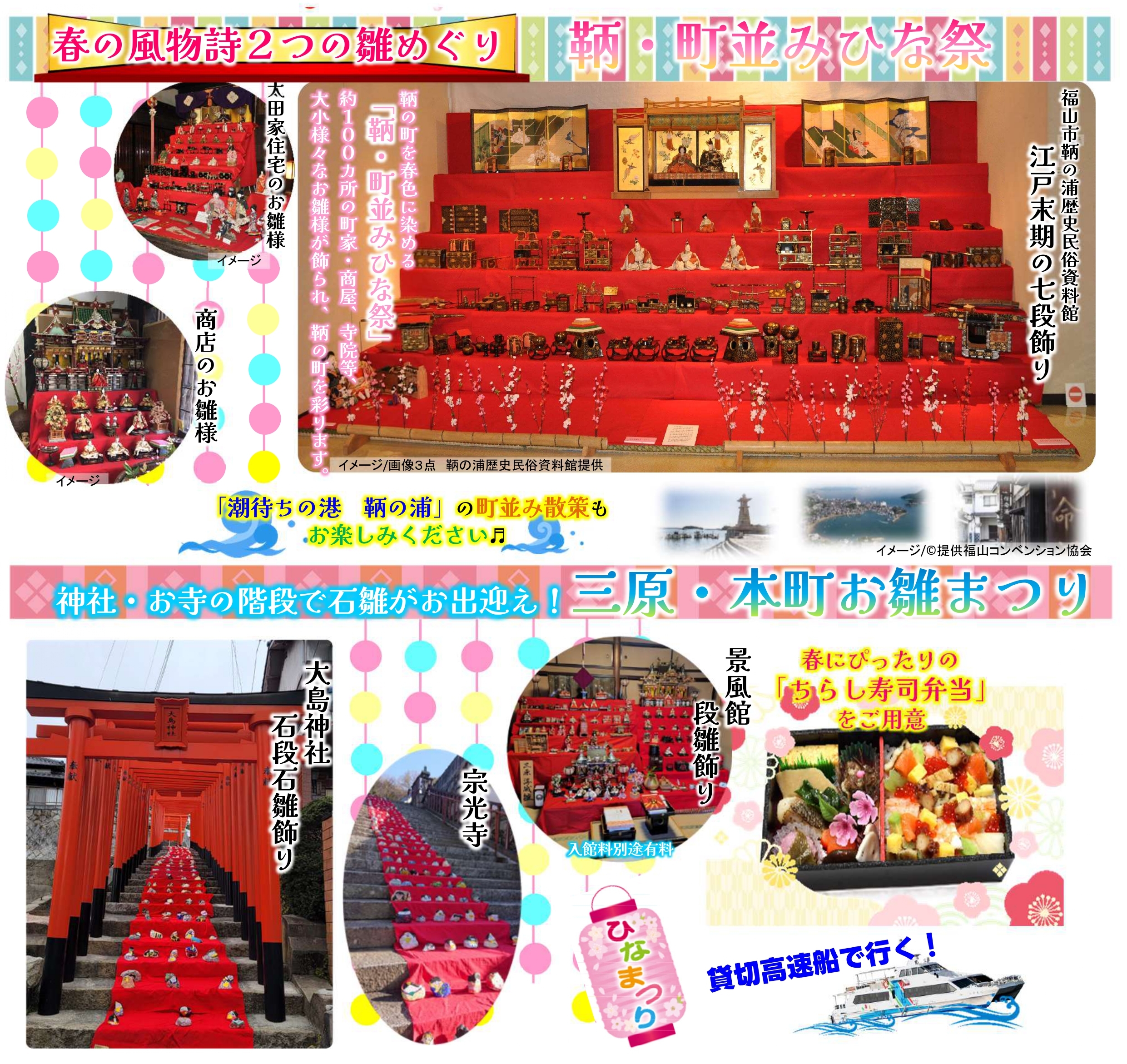 宮島口港(8:05発)~〈貸切高速船〉~広島港(8:30発)~プリンスホテル前桟橋(8:35発)~呉港(9:00発)~(船上より戦艦大和建造ドック跡・海上自衛隊呉基地・音戸の瀬戸)~~三原港…◎三原・本町お雛まつり/年に2日間だけ行われるメインのひな祭りイベント開催!城下町三原の雛飾りを自由散策<約1時間半滞在>※有料施設各自払い~船内にて■ちらし寿司弁当のご昼食~鞆の浦港…町に代々伝わる大小様々な雛飾りを約100ヶ所に展示している◎鞆・町並みひな祭見学。鞆の浦歴史民俗資料館や●太田家住宅のお雛様見学。自由散策。<約2時間滞在>※太田家住宅以外の有料施設各自払い…鞆の浦港~~呉港(18:00着)~プリンスホテル前桟橋(18:25着)~広島港(18:30着)~宮島口港(19:10着)