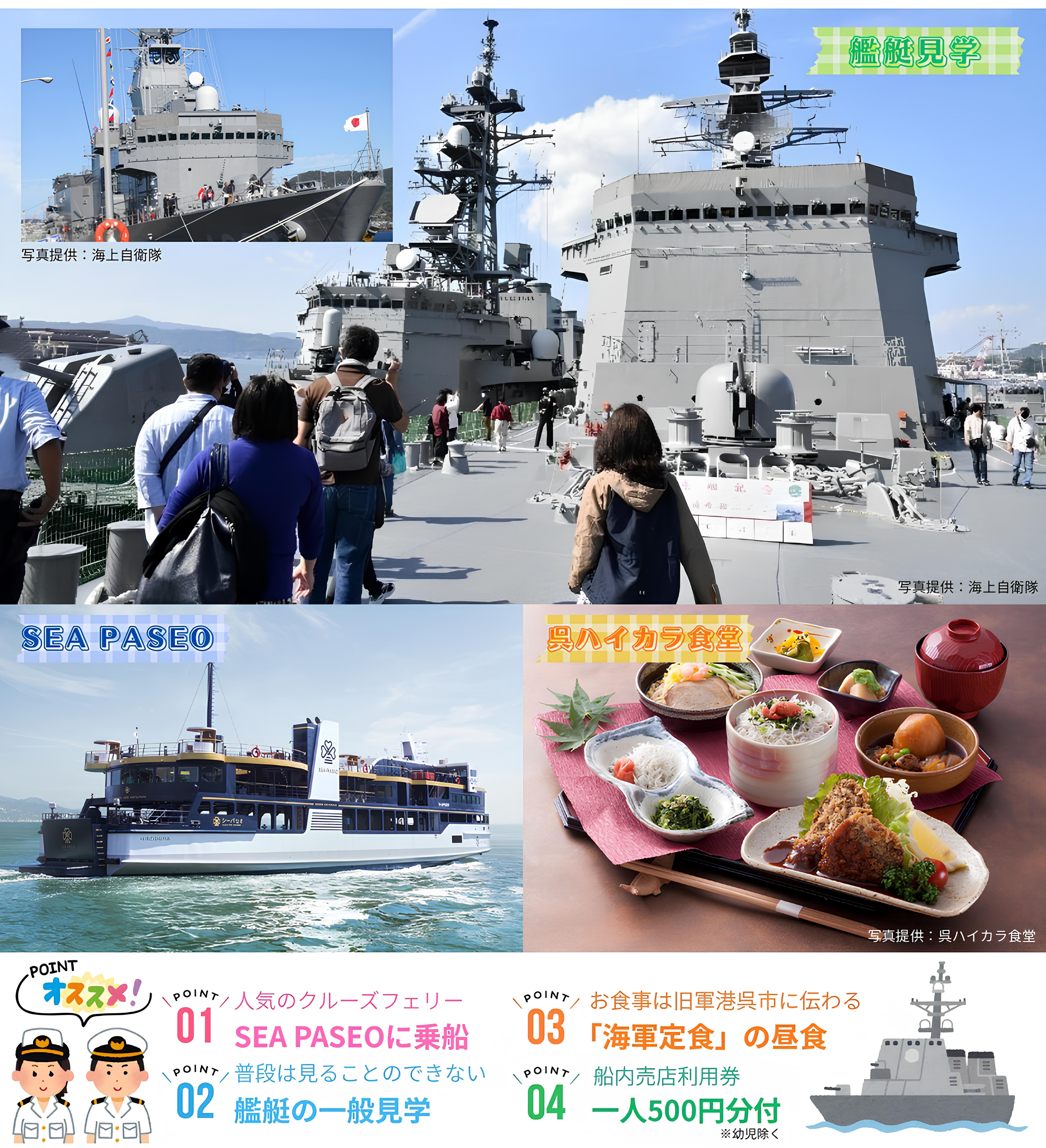 広島港(11:20発)~~SEA PASEO~~呉港…徒歩約5分…■呉ハイカラ食堂/旧軍港呉市に伝わる「海軍定食」(昼食)==貸切バス==アレイからすこじま専用駐車場…徒歩約8分…◎海上自衛隊呉地方隊/艦艇一般見学(各自自由見学/約90分)…アレイからすこじま専用駐車場==呉港~~SEA PASEO~~広島港(16:57着)