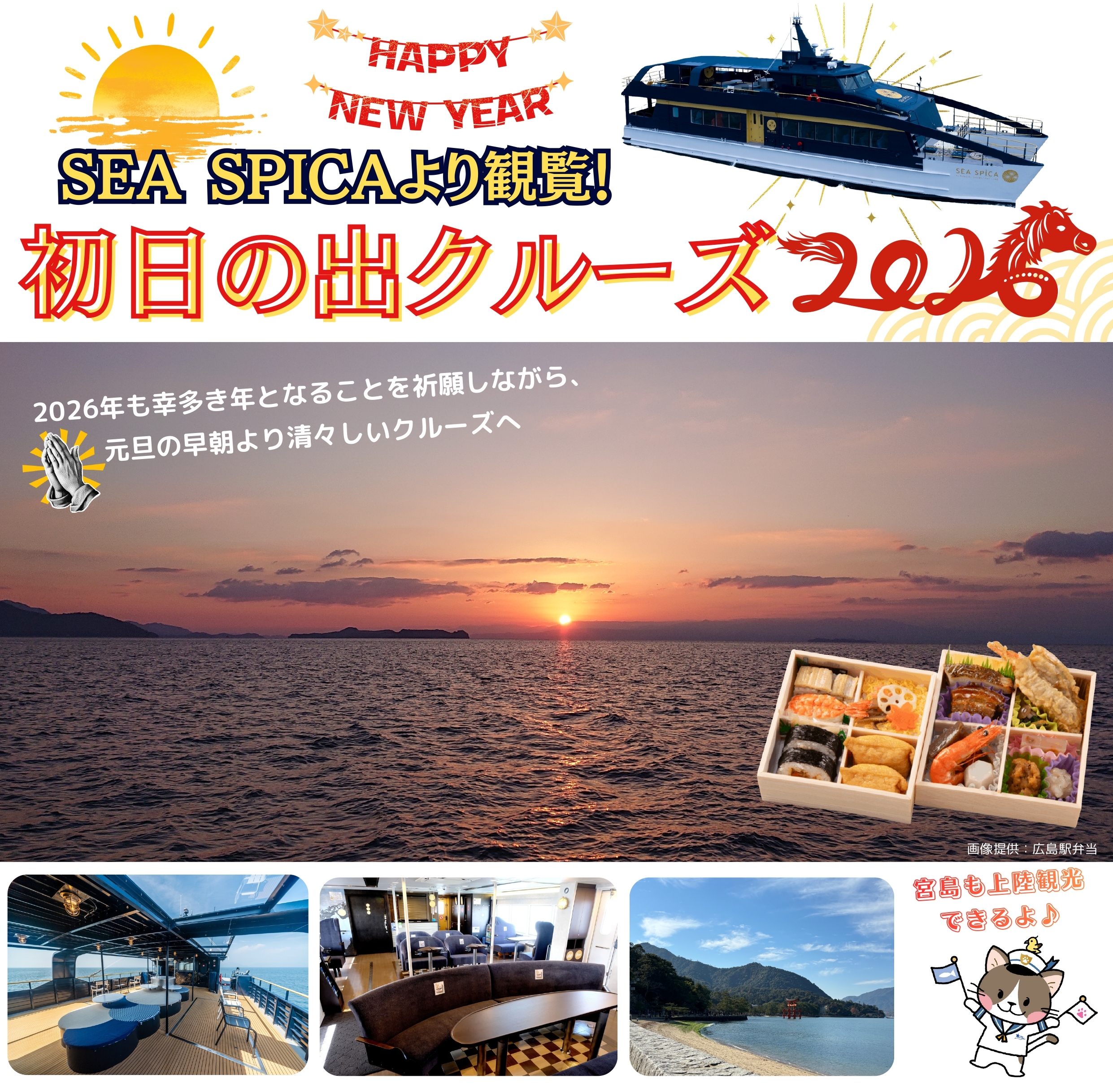 広島港(5:55発)~~SEA SPICA~~プリンスホテル前桟橋(6:00発)~~呉港(6:25発)~~〇音戸の瀬戸~~〇安芸灘付近より初日の出をご鑑賞/初日の出7:16頃~~宮島港…◎宮島/商店街、厳島神社自由参拝…宮島港~~■船内にてお弁当のご昼食~~広島港(12:00着)~~プリンスホテル前桟橋(12:05着)~~呉港(12:30着)