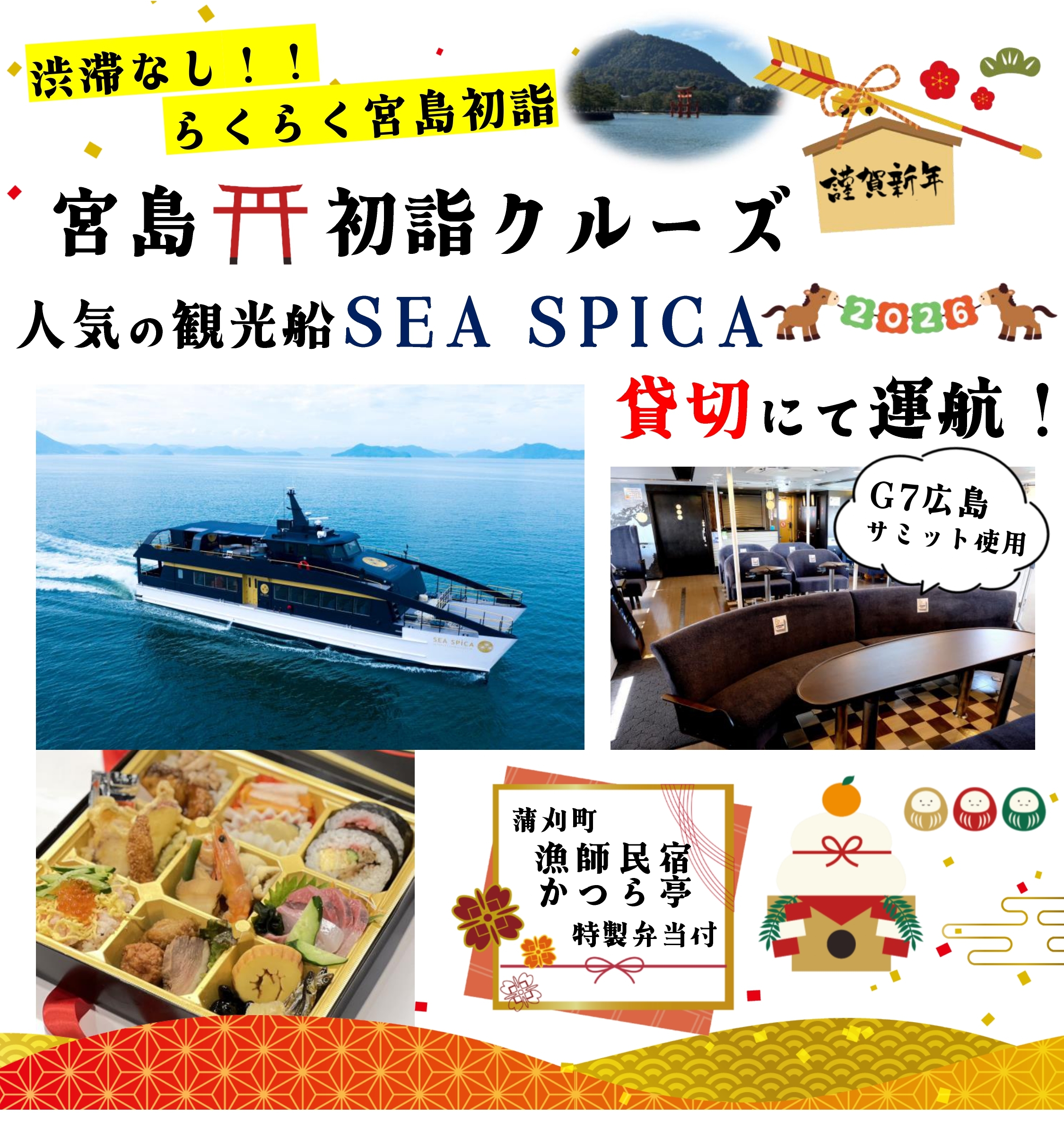 広島港(11:00発)~~<SEA SPICA>~~呉港(11:35発)~~船内にて■漁師料理かつら亭/特製弁当(昼食)~~宮島港…◎宮島/フリータイム(約3時間)…宮島港~~広島港(16:15着)~~呉港(16:50着)