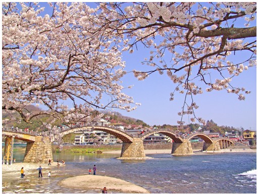 錦帯橋は日本三名橋の1つに数えられる美しい五連アーチの木造橋「錦帯橋」。3月下旬から4月上旬には周辺に咲き誇る約1500本の桜と錦帯橋のコントラストが織り成す美しい景色をご覧いただけます!