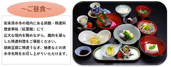 広島駅新幹線口(8:20)==アストラムライン古市駅(8:40)==三次駅前(9:50)== ☆安来清水寺(30分)●紅葉館(旬の食材を使った種類豊富な精進料理の昼食/60分)== ★足立美術館(100分)==○道の駅酒蔵奥出雲交流館(20分)== ==三次駅前(17:00)==アストラムライン古市駅(18:10)==広島駅新幹線口(18:30) |