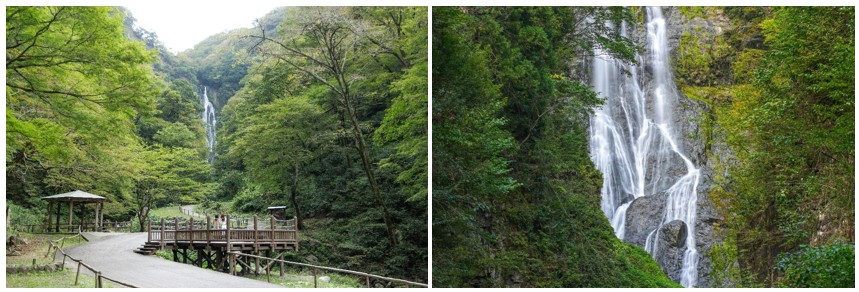 神庭の滝は「日本の滝百選」にも選ばれた、高さ110m、幅20mの中国地方随一のスケールを誇る名瀑。断崖絶壁を流れ落ちる滝の豪快さはいうまでもなく、まるで白布をまとったようにも見える水しぶきは神秘的な美しさです。滝の中央には黒い岩が突起し、落下する水しぶきに逆らってのぼる鯉に似ていることから「鯉岩」と呼ばれています。