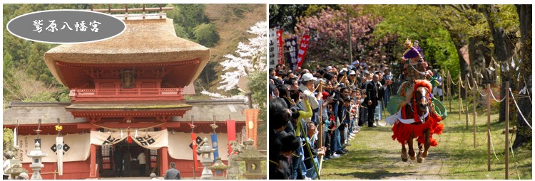 社殿は国指定の重要文化財に指定され、室町時代後期の特徴を色濃く残した建築様式です。境内には鎌倉時代から続く歴史と、唯一現存する原型を留める日本最古の流鏑馬馬場があり、4月には流鏑馬神事も執り行われる、馬と非常に縁の深い神社となっています。