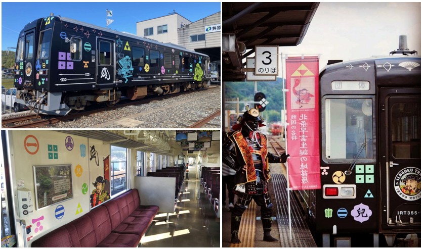 黒い車体に北条早雲や沿線9氏族の家紋を描いた、戦国時代をテーマにしたラッピング列車です。車内は城柵や足軽のデザインで飾られ、歴史解説パネルも設置されており、山城や歴史スポットが点在する沿線の雰囲気と歴史を深く楽しめる魅力的な観光列車です。
