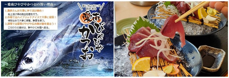 愛媛県南部の漁師町、愛南町で水揚げされる「愛南びやかつお」は、鮮度と弾力、脂の乗った濃厚な旨味が特徴の極上のカツオです。「びや(びやびや)」とは、愛南地方の方言で「新鮮」という意味します。 釣り上げたかつおをすぐに活け締めし、船上で血抜き処理を行うことで、身が締まり、驚くほどの弾力と鮮度を保ちます。かつおといえば、かつおのタタキが有名ですが、愛南びやかつおは生で食べることで、より一層味わいを感じることができます。