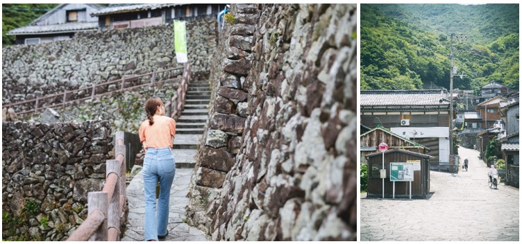 入江に面した急斜面には民家が山の中腹まで続き、それぞれの民家は、台風や季節風から家や暮らしを守るため、軒に達するほどの石垣が整然と積み上げられています。