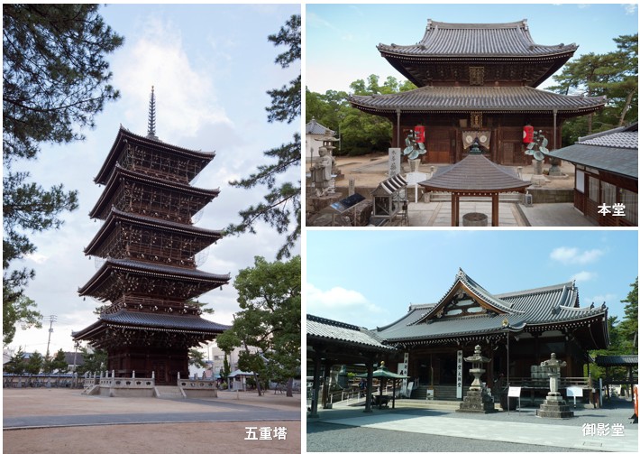 774年に空海が誕生した場所で、四国八十八カ所霊場の札所でもあります。真言宗善通寺派の総本山。約4万5,000㎡の寺域には金堂(本堂)、御影堂、五重塔、大楠、薬師如来像、宝物館などたくさんの見所があります。また、強力なパワースポットとしても有名で、厄除け、家内安全、身体健康、合格祈願など、様々な願いが叶う「お願い事がよく通る」ご利益があります。