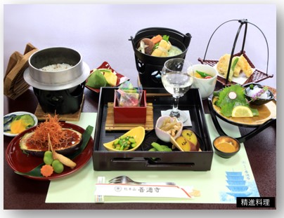 四季折々の地元産の食材を使い、四十種類の色とりどりの食材が彩る精進料理。地元善通寺市特産の讃岐もち麦を使用した”大師もち麦まんじゅう”は、もちもちした食感と豊富な食物繊維で好評です。食堂で境内の庭園を眺めながら、心も体も美しくなるような精進料理を堪能できます。