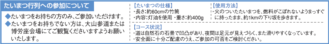 備考 ※基本的にはたいまつ行列に参加になりますが、たいまつを持っての歩行に不安のある方は見学のみでも可能です。ご予約の際は、【行列に参加】か【見学のみ】かを必ずお選び下さい。