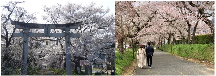 370m続く参道の両側に、しだれ桜とソメイヨシノあわせて約360本が咲き並び、毎年4月上中旬に満開の花でおおわれます。まるでピンクのトンネルのような参道の散策をお楽しみください。