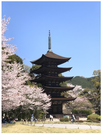 ●令和の大改修を終えた日本三名塔のひとつに数えられる国宝瑠璃光寺五重塔。境内には約170本のソメイヨシノに彩られます。