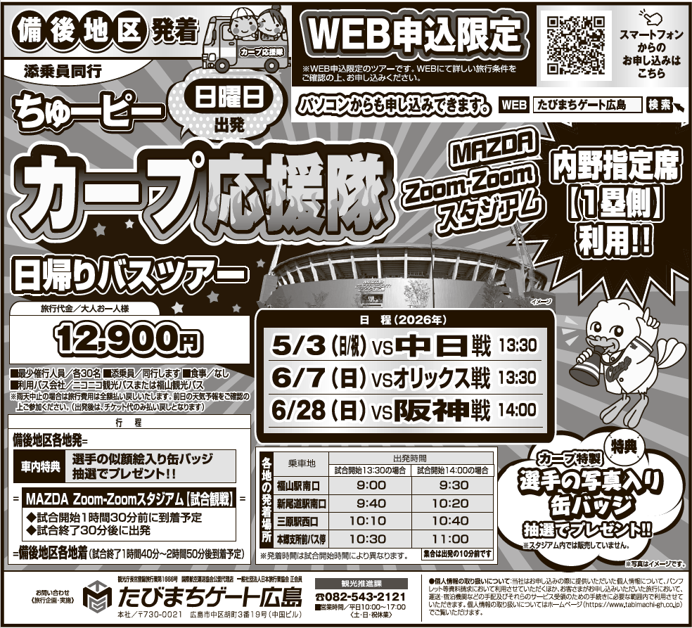 福山駅南口==新尾道駅南口==三原駅西口==本郷支所前バス停== 9:00発 9:40発 10:10発 10:30発 MAZDA Zoom-Zoomスタジアム【13:30~試合観戦】 12:00頃着 中日ドラゴンズ戦/一塁側内野指定席 ◆試合終了後30分後に出発 本郷支所前バス停==三原駅西口==新尾道駅南口==福山駅南口 ◆試合終了後1時間40分~2時間50分後頃到着予定 |