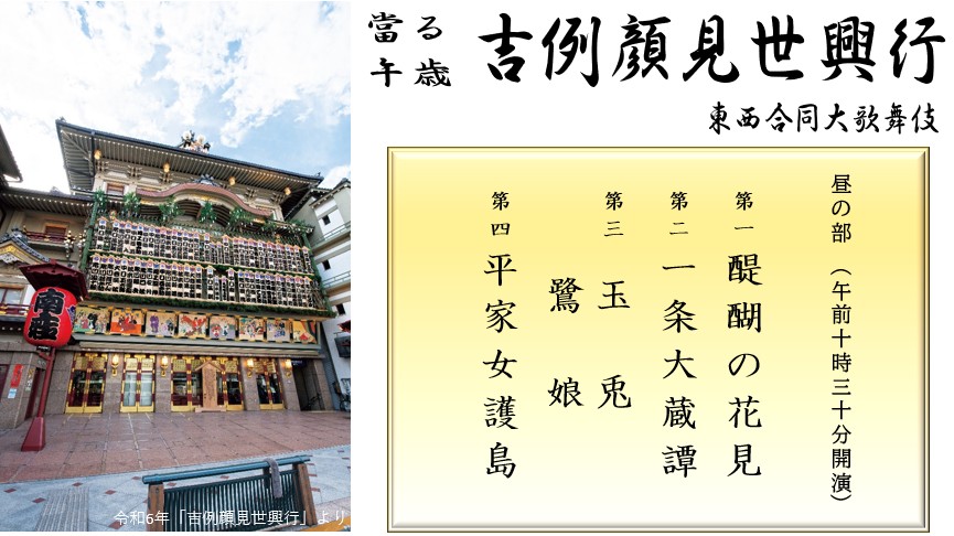 広島駅(07:18発)<JR>福山駅(07:41発)<JR>京都駅=★南座【當る午歳 吉例顔見世興行 東西合同歌舞伎/昼の部10:30開演】・・・☆祇園花街(自由散策)=京都駅<JR>福山駅(19:22着)<JR>広島駅(19:46着) |