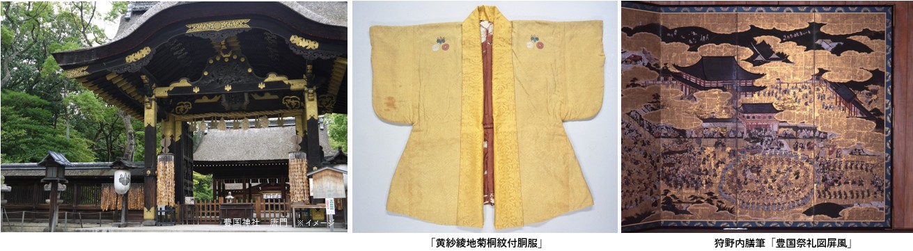 豊臣秀吉を祀る「出世開運・良縁成就」のご利益で知られる神社。唐門(国宝)は伏見城の遺構と伝えらえています。書院の公開では、秀吉の羽織「黄紗綾地菊桐紋付胴服(きさやじきくきりもんつきどうふく)」を特別展示。合わせて拝観できる宝物館では、桃山絵画の傑作、狩野内膳筆「豊国祭礼図屏風(ほうこくさいれいずびょうぶ)」や秀吉が使ったとされる「獏御枕(ばくのおんまくら)」、秀吉の奥歯と伝わるものまで縁の社宝を多数拝観できます。