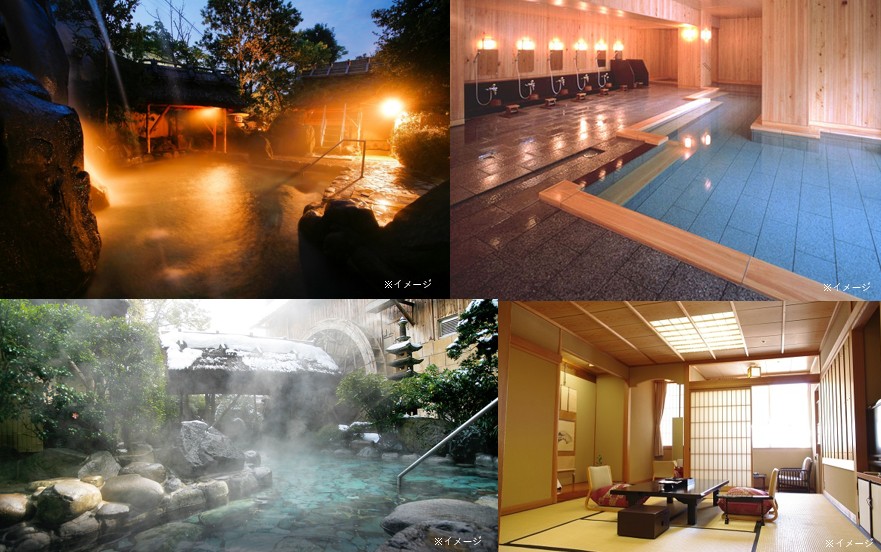 温泉は自家源泉を4つ所有しており、大浴場や露天風呂はもちろん、すべてのお部屋のお風呂や洗面台の蛇口からも天然かけ流し温泉が出ます。泉質は「ぴかぴか・ぽかぽか・ぷるぷる」の美肌効果が期待できるとされています。