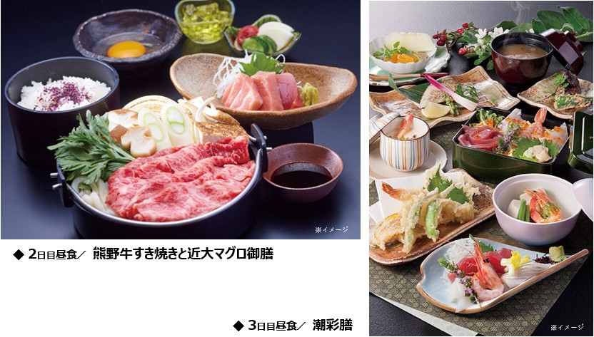2 ホテル=☆世界遺産:熊野本宮大社・・・☆和歌山世界遺産センター=●瀞峡めぐりの里(昼食:熊野牛すき焼きと近大マグロ御膳)=☆熊野速玉大社=☆熊野那智大社・・・☆青岸渡寺=白浜温泉