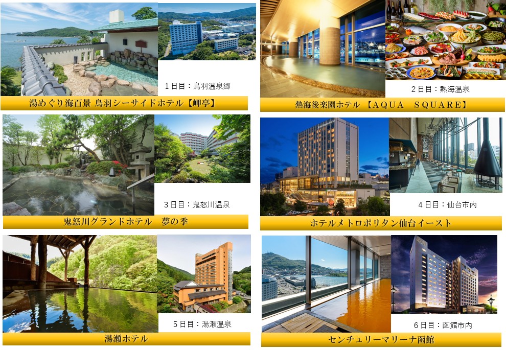 ※満80歳以上の方は、2名様以上でお申込みください。 ※小学生以下のお子様は受付いたしません。 ※4名1室利用の4・6泊目の宿泊客室はツイン2室利用、2・4泊目はベッド2台とエキストラベッド1台、6泊目はツインとシングルのご用意となります。 ※3名1室利用の2泊目のホテル客室は、山側眺望となります。 |