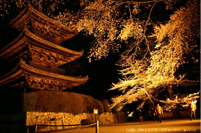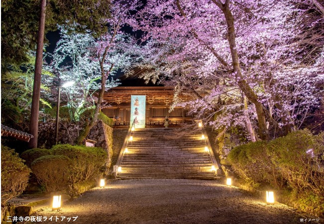 三井寺は天台寺門宗の総本山。近江八景「三井晩鐘」の鐘楼などに加え、多数の文化財を収蔵しています。大津屈指の桜名所としても知られており、桜の季節を迎えると約1,300本のソメイヨシノや山桜、しだれ桜が咲き誇ります。今回はライトアップにより色鮮やかに輝く幻想的な夜桜をお楽しみください。