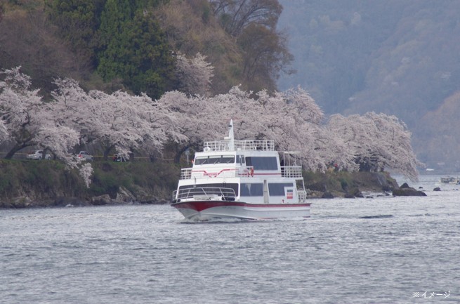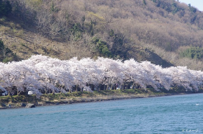 「日本のさくら名所100選」にも選ばれている海津大崎の桜。約800本のソメイヨシノがびわ湖岸約4キロメートルに渡り続きます。例年の見頃は4月上旬となり、関西圏では遅咲きの桜名所として知られています。また、海津大崎は琵琶湖八景「暁霧・海津大崎の岩礁」としても知られる景勝地であり、びわ湖随一の岩礁と湖の碧、そして遠くに望む竹生島の絶妙なコントラストが美しく、毎年多くの花見客で賑わいます。途中、海津大崎で下船し桜並木の散策もお楽しみいただけます。