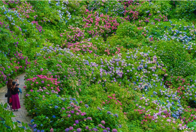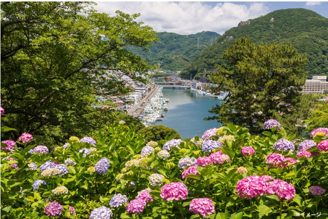 下田市街と下田港を一望できる下田公園は、国内有数のアジサイの群生地です。6月になると約100種以上、約300万輪ものアジサイが色とりどりに咲き誇ります。360度のアジサイに埋めつくされる景色は圧巻です。<あじさい祭 毎年6月1日から30日に開催>
