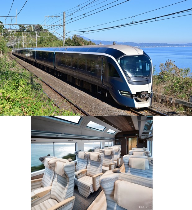 サファイヤのように上品に輝く「サフィール踊り子」は、東京から伊豆をつなぐ全車両グリーン席の観光列車。高い天井と天窓から光が差し込む車内は解放感ある空間です。ゆとりあるシートに車窓から広がる絶景の海景色。ワンランク上の伊豆の旅をお楽しみください。