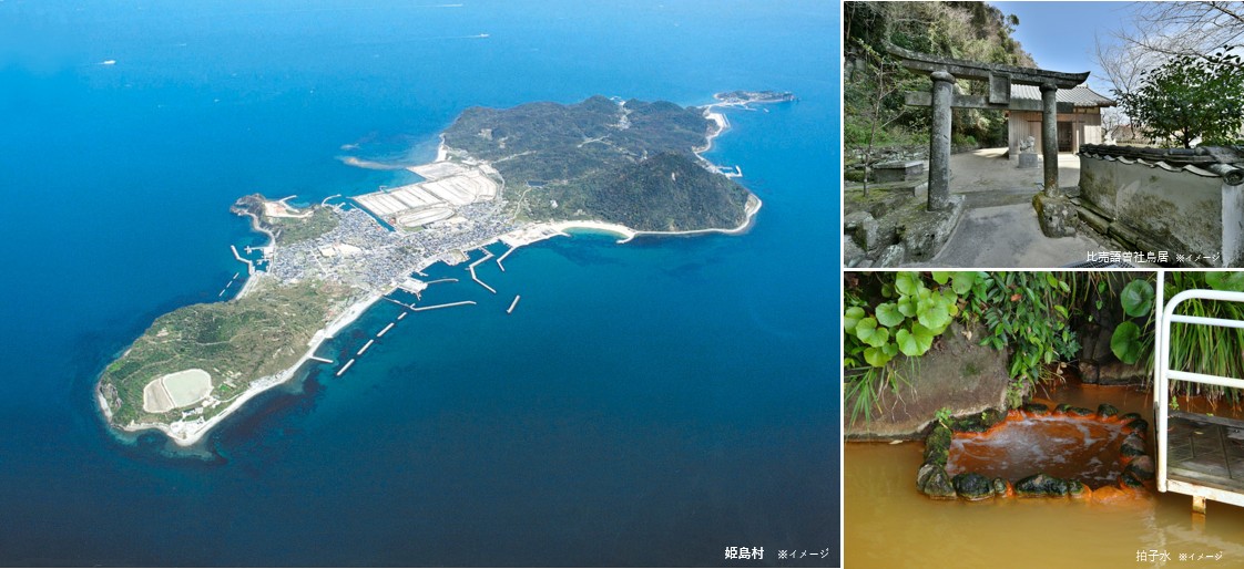 島の守り神として信仰を集める比売語曽社、海岸近くに湧く珍しい温泉・拍子水温泉や、美しい海岸風景が広がるみつけ海岸など、島の見どころをご案内します。