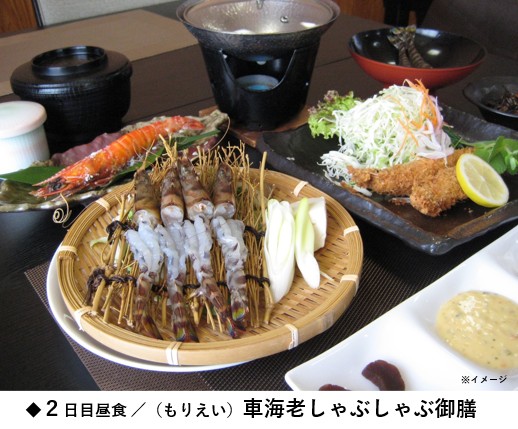 ●豊かな海に囲まれた姫島名物の車海老を味わう「車海老しゃぶしゃぶ御膳」の昼食。新鮮な車海老の旨みを生かした料理をお楽しみください。