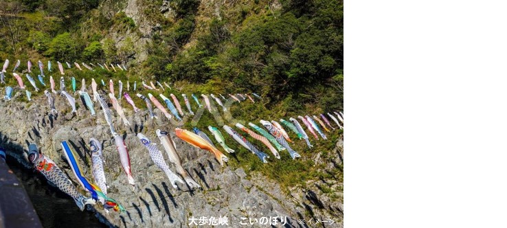 ●3月下旬から5月末にかけて、大歩危峡の川面の上を悠々と泳ぐ鯉のぼり。子どもの成長を願い全国から送られてきた鯉のぼりが、大歩危に春を告げます。