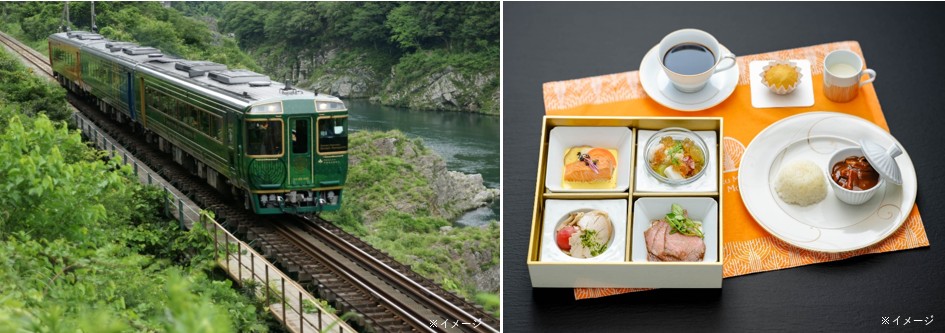 列車内では金刀比羅宮が運営する神椿(かみつばき)の調理長監修「さぬきこだわり食材の洋風料理」をご用意します。洋食ならではの技法をこらし、千年ものがたりオリジナル版として製作。厳選した香川県の地元食材を使ったお食事を提供します。