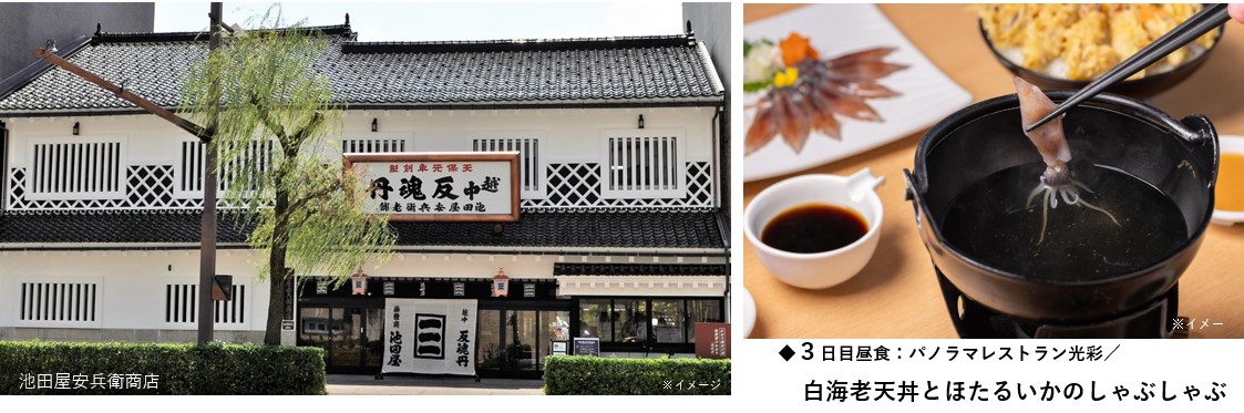 貸切バスの長距離移動を抑え(通常運転の連続走行が最長でも約1時間)、信州から新潟、北陸まで巡る2泊3日です。