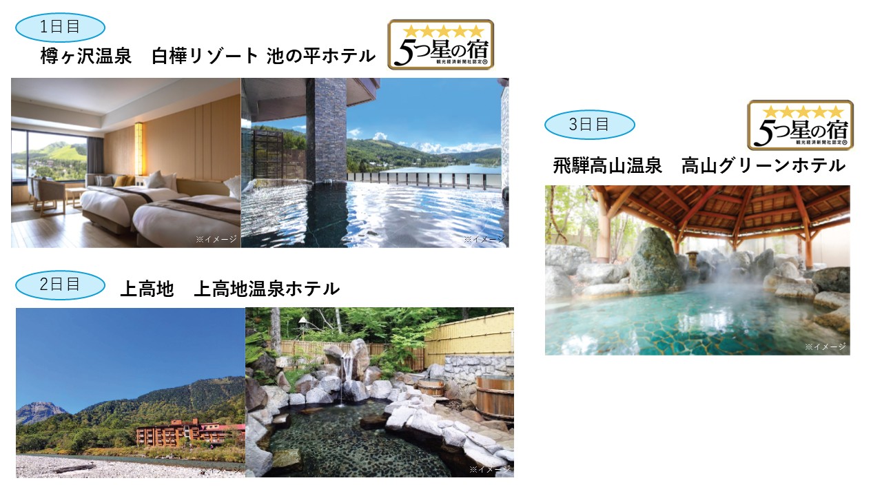 ホテル==霧ケ峰ビーナスライン==☆美ヶ原高原(美しの塔・山本小屋ふるさと館)==●昼食:フレンチランチコース(松本市内)==★国宝・松本城==上高地へ 【散策されるお客様】 大正池前・・・・・大正池・・・・・田代池・・・・・田代橋・・・・・上高地温泉ホテル【泊】 *所要時間約1時間 【散策されないお客様】 上高地帝国ホテル前バス停・・・・・上高地温泉ホテル【泊】 *所要時間約15分 ※お客様の大きなお荷物は上高地帝国ホテル前バス停から、直接ホテルへお運びします(お一人様1個)。散策もホテルまでのご移動も徒歩となりますので、貴重品のみお持ちいただき身軽にご移動ください。 |
