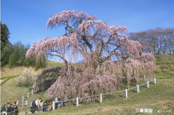 日本三大桜に数えられる滝桜は、大正11年10月12日に、桜の木としては初めて国の天然記念物に指定された名木。開花期には四方に伸びた枝から、薄紅色の小さな花を無数に咲かせ、その様はまさに流れ落ちる滝のように見えることから「滝桜」と呼ばれるようになったとも言われています。<例年の桜見頃:4月中旬~下旬>