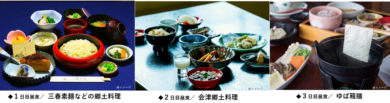 ホテル=☆さくら100選・鶴ケ城公園=☆飯盛山=●昼食:棒タラ煮やニシンなどの会津郷土料理(会津)=西若松駅+++[会津鉄道・お座トロ展望列車貸切]+++湯野上温泉駅=★茅葺き屋根の町並み・大内宿=ホテル(泊) |