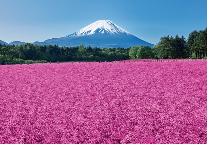 鮮やかなピンク色のコントラストが美しい富士山を彩る春の絶景をお楽しみください。
