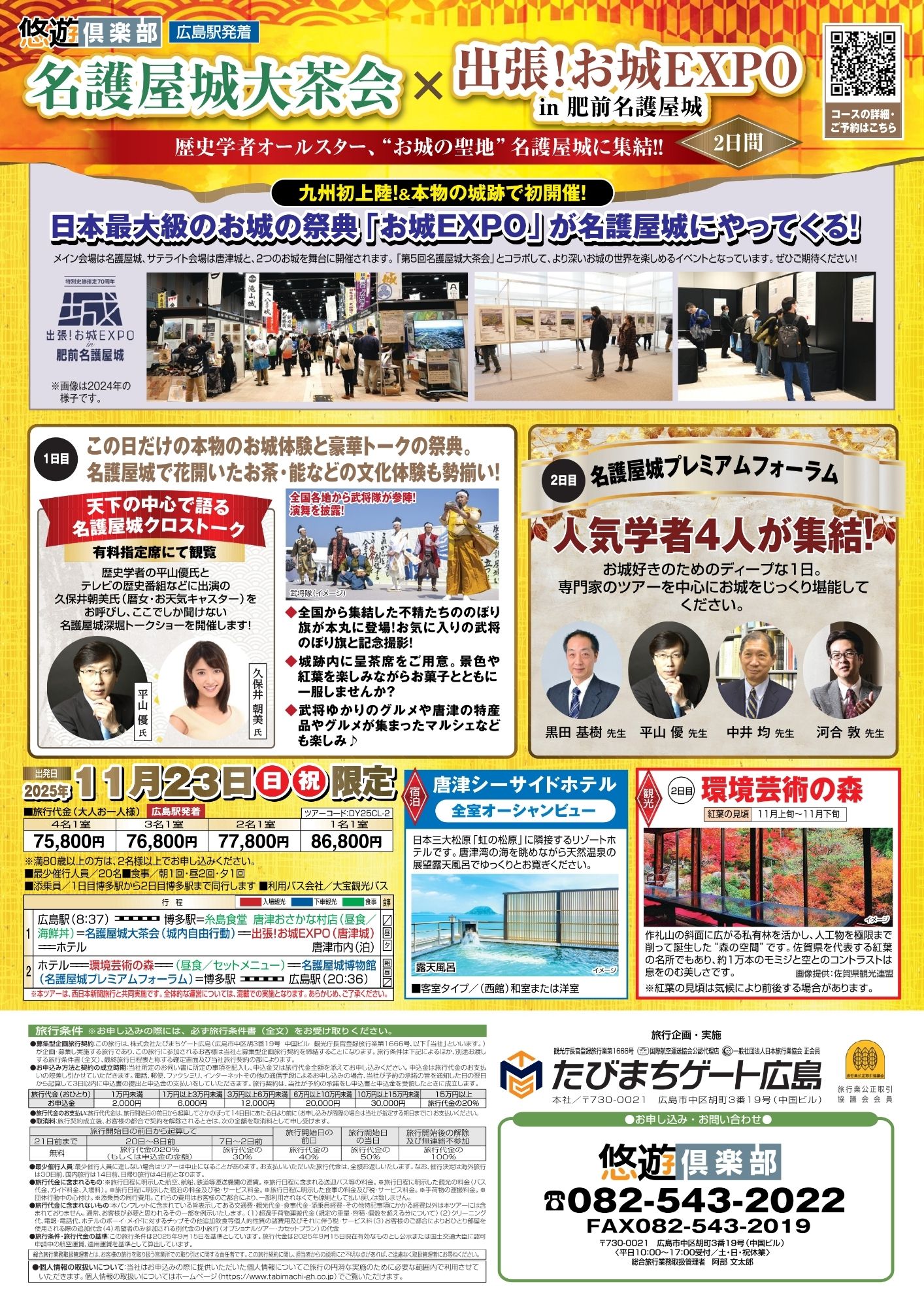 広島駅(8:37)<JR>博多駅=●昼食/海鮮丼=☆名護屋城大茶会(城内自由行動)/13:30~14:30平山優先生によるトークショー観覧=★出張!お城EXPO=唐津市内(泊) |