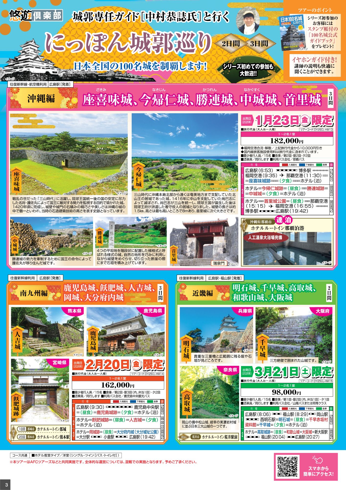 ホテル=★岡城(荒城の月のモデルにもなった城)=(●弁当昼食)=☆大分府内城(近世城郭の特徴が色濃く残る城)=大分駅<JR>小倉駅<JR>広島駅(19:42着) |