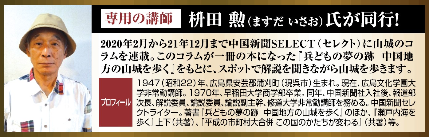 2020年2月から21年12月まで中国新聞SELECT(セレクト)に山城のコラムを連載していた、枡田勲(ますだいさお)氏が講師として同行。このコラムが一冊の本になった『兵どもの夢の跡 中国新聞の山城を歩く』をもとにツアー設定、スポットで解説を聞きながら山城を歩くツアーです。