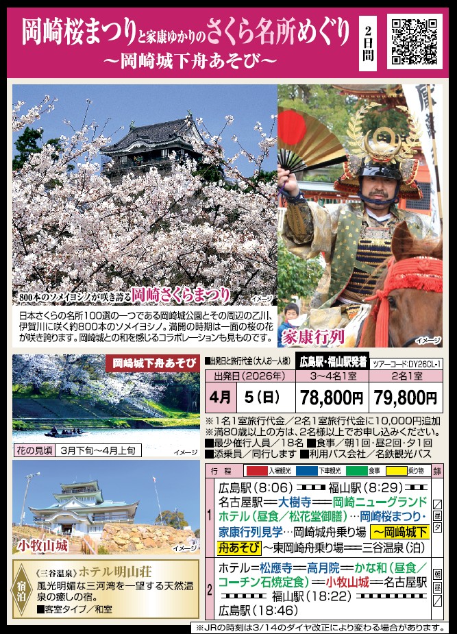 広島駅(8:06発)<JR>福山駅(8:29発)<JR>名古屋駅=●岡崎ニューグランドホテル(昼食/松花堂御膳)=☆大樹寺=☆岡崎桜まつり・家康行列観覧=三谷温泉(泊) |