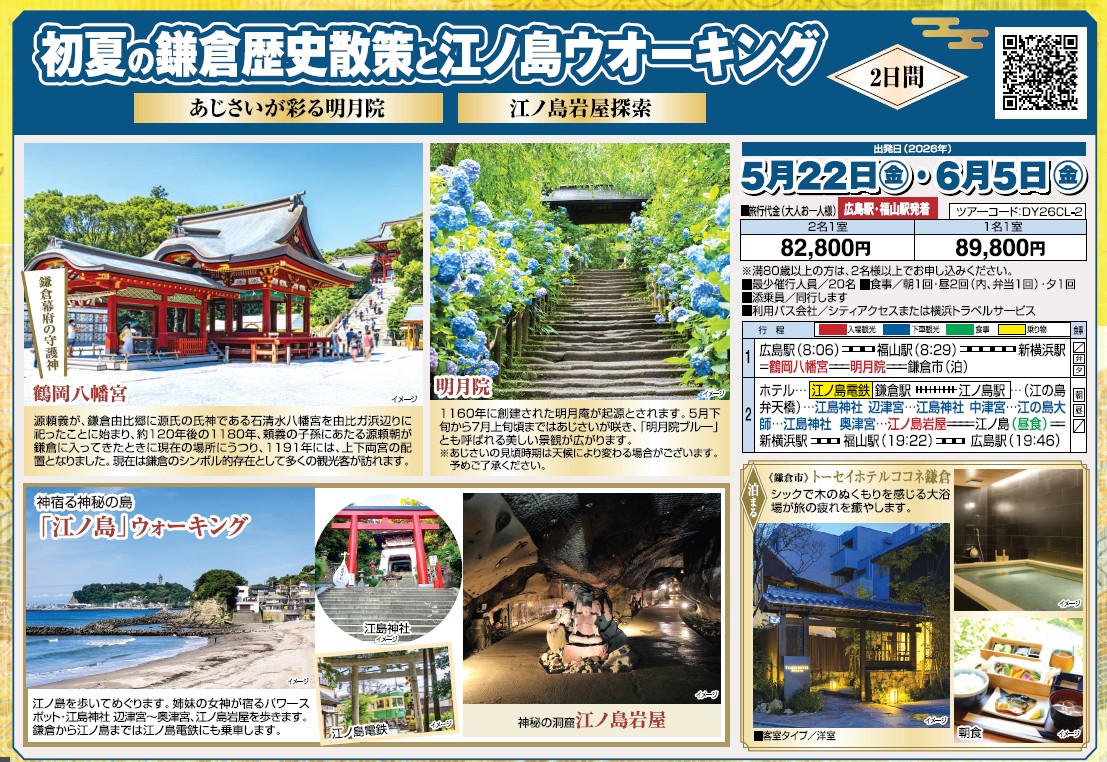 ホテル…鎌倉駅<江ノ島電鉄>江ノ島駅…☆江島神社 辺津宮…☆江島神社 中津宮…☆江ノ島大師…☆江島神社 奥津宮…★江ノ島岩屋・・・●昼食=新横浜駅<JR>福山駅(19:22着)<JR>広島駅(19:46着) |