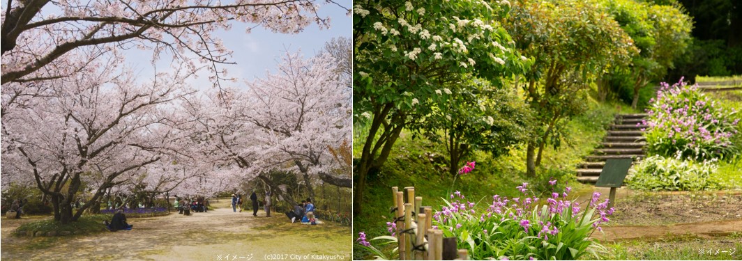 ●九州の最東端・北九州市門司区の東側に位置する植物公園です。 四季折々に 花・みどり・自然に親しめる和風の自然型庭園。70年以上にわたって収集してきたサクラおよそ60品種・700本。4月はソメイヨシノをはじめシダレ桜や八重咲系統がつぎつぎと咲き、園内全体を桜色に染め上げます。