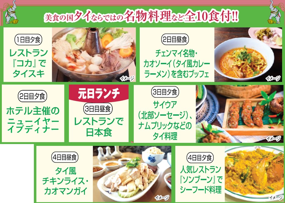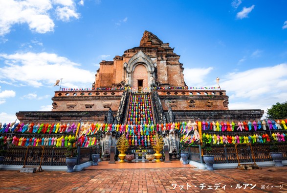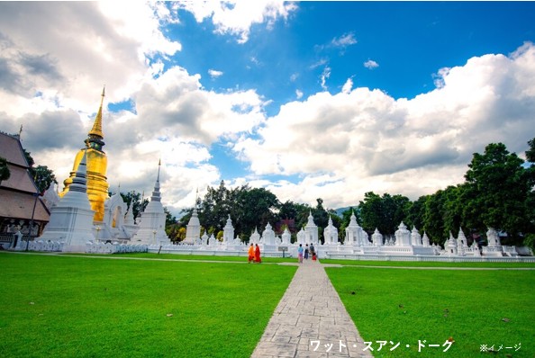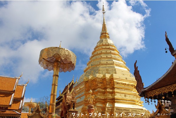 (※希望者は、1泊分の荷物のみご持参ください。) ●ホテルにて朝食後、空港へ。国内線を利用し、バンコク第二の都市・チェンマイへ バンコク・スワンナプーム空港✈✈<国内線>✈✈チェンマイ空港 着後、 ●昼食/チェンマイ名物・カオソーイ(タイ風カレーラーメン)を含むビュッフェ 標高1,080mステープ山頂にある寺院★ワット・プラ・タート・ドーイステープへ ワゴン車とケーブルを乗り継ぎ、高さ22mの黄金に輝く仏塔へご案内 観光後、ホテルへ ●夕食/ホテル主催のニューイヤーイブディナー 食後、ご希望の方のみ活気あふれるナイトバザールとターベー門付近で開催されるカウントダウン花火観賞へご案内します(徒歩移動) |