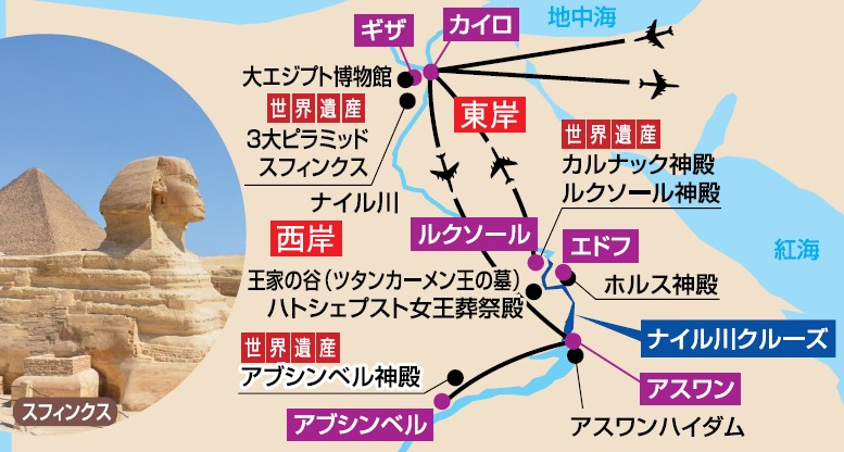 ※エジプトの全ての遺跡は政府の指示により公開中止または観光箇所の制限などの措置が突然とられることがあります。その場合、可能な限り日程の入れ替えや代替観光で対応いたしますが、やむを得ず入場できない場合には入場料をご返金いたします。 (注1)6月14日、エジプト考古省より「昨今の世界情勢を鑑みて大エジプト博物館のグランドオープンを延期する」との連絡がありました。延期後の開館予定日は未定です。正式なオープンこそしておりませんが、大エジプト博物館はすでに観光客に向けて開放されており、メインギャラリーやミュージアムショップを含む館内施設の8割方は見学可能です。主たる展示物が大エジプト博物館に移送された場合、カイロ考古学博物館の見学はせず、大エジプト博物館のみご案内します。 (注2)エジプトの国内線の運航スケジュールは流動的なため、発着時間は変更となる場合があります。 (注3)エジプト政府の要請により、貸切観光が昼、または夜に変更となる場合があります。その場合、観光順番を入れ替えてご案内します。 |