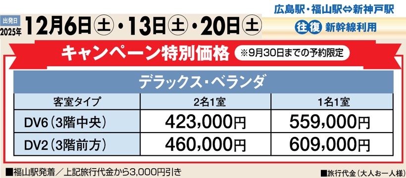 • 出発地 / 広島駅・福山駅~新神戸駅/神戸港(※各自で神戸港へ移動)
